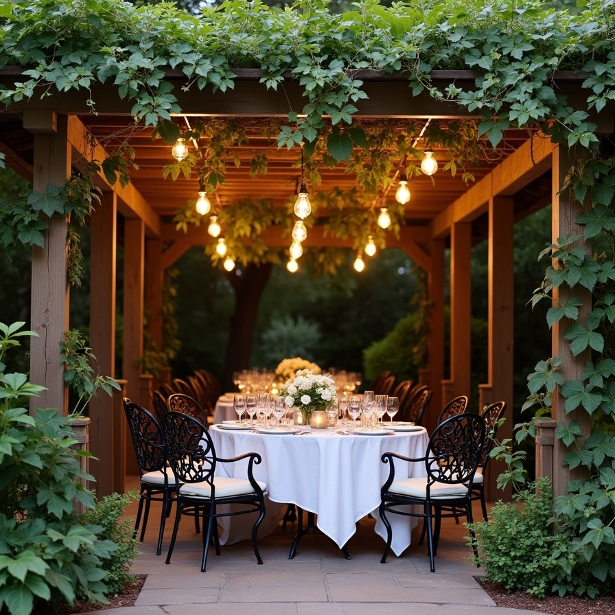 This setup feels like an afternoon that quietly stretches into evening, where no one checks the time. Climbing greenery, soft ambient lighting, and classic iron furniture give it old-world garden party energy—elegant yet inviting. The intimacy of the space encourages slow, unhurried meals, with fresh flowers naturally integrated into the setting. It’s a dining experience where every element—from the textures to the lighting—creates a ritualistic sense of comfort, making each meal feel like a special, timeless occasion.