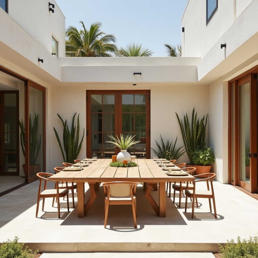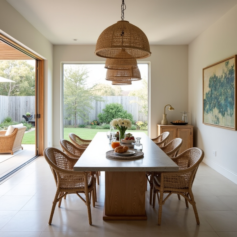 This dining area seamlessly bridges interior and exterior spaces, creating an airy, calm environment. Soft neutrals, woven textures, and oversized pendant lighting cultivate a coastal feel, inviting long, leisurely brunches and extended conversations. The open layout allows natural light to wash over the table, emphasizing connection with the outdoors. Each element is purposeful, supporting a sense of tranquility and ease. It’s a setting where the boundary between inside and outside disappears, offering a perfect extension of living space into nature.