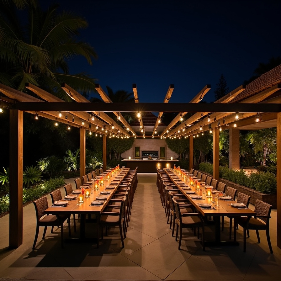 This dramatic dining setup comes alive after dark, blending sleek pergolas with layered lighting and lush greenery. The result is a resort-style atmosphere perfect for long dinners with low music and warm, inviting lights. Every element emphasizes comfort and style, making it ideal for social gatherings that stretch into the night. Thoughtful design ensures that even in a bold, tropical setting, intimacy is maintained. It’s a space where guests feel immersed in atmosphere while remaining connected to the natural surroundings.