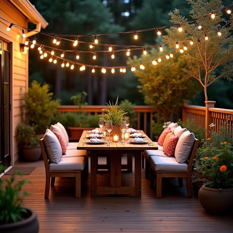String lights immediately create mood in this relaxed deck dining space. Warm wood surfaces, layered plants, and casual seating combine for a welcoming, intimate environment. The design prioritizes comfort over styling, making meals feel effortless while the ambiance carries the weight of the experience. Perfect for everyday dinners or quiet evening conversations, the backyard invites lingering and enjoying the space without distraction. Every choice, from furniture to lighting, enhances a natural sense of ease and cozy charm.