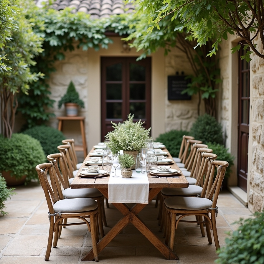 Timeless design defines this European-inspired courtyard dining space. Stone walls, weathered textures, and simple table styling evoke a countryside villa aesthetic. The charm lies in imperfection—nothing is overly staged, creating a collected, lived-in environment meant for shared meals. Natural materials and soft finishes invite guests to linger, emphasizing comfort, warmth, and the joy of slow dining. Every detail, from the tableware to the surrounding greenery, works together to create an intimate, rustic outdoor experience with authentic elegance.
