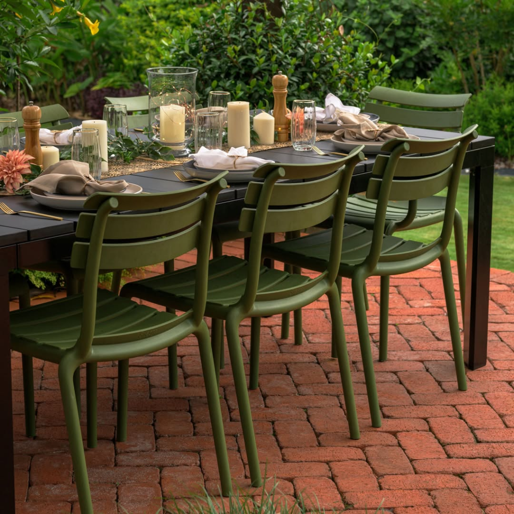 This backyard dining space grounds modern design in natural textures and colors. Deep green chairs paired with warm brick create a structured yet relaxed environment, perfect for long dinners and conversation-filled evenings. The space balances contemporary aesthetics with approachable warmth, while the layered earth tones and candlelight evoke a sense of effortless hosting. Every detail enhances the welcoming atmosphere, demonstrating that modern outdoor dining can be both chic and inviting without feeling formal or over-designed.