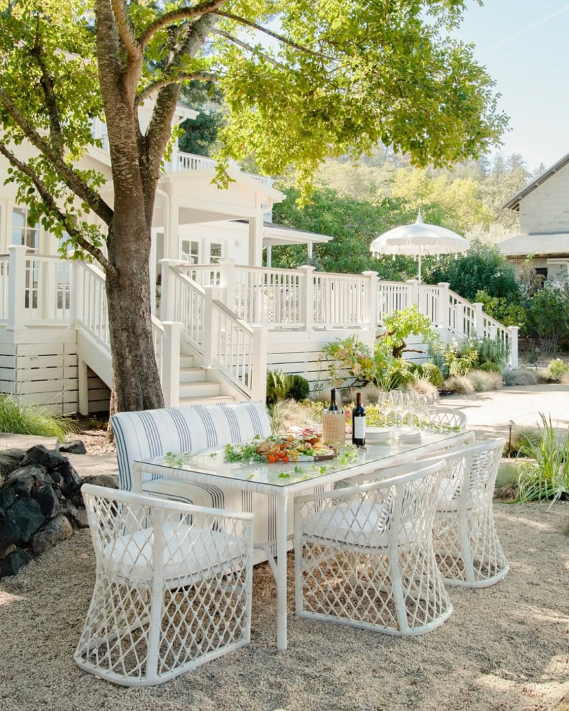 Evoking the charm of Italian hillside terraces, this dining spot combines vine-covered pergolas, rustic tables, and sun-faded textures. The space feels lived-in, authentic, and rich with character, encouraging leisurely meals and meaningful conversation. Plates, bread, and natural decor elements integrate seamlessly, creating a sense of storytelling through design rather than staging. The result is a backyard that balances history, warmth, and intimacy, making every meal feel like a moment to savor.