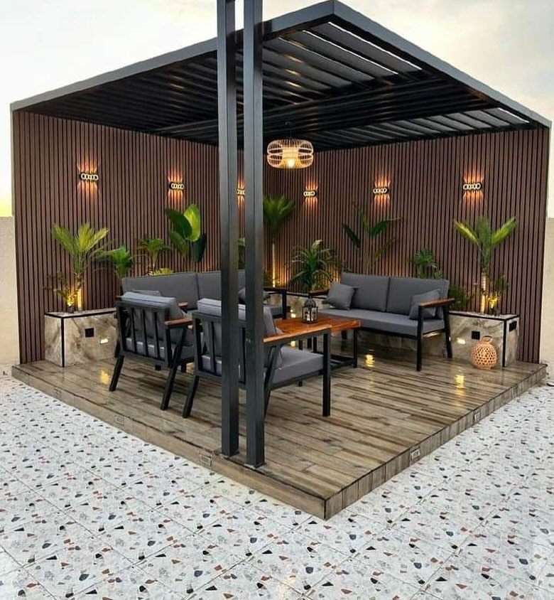 Bold and contemporary, this pergola dining space functions like an outdoor room. Warm wood, structured pergolas, and layered lighting create a cozy yet uncluttered environment suitable for intimate dinners or lively gatherings. The design balances modern aesthetics with comfort, ensuring the area feels inviting for long evenings. Every choice, from furniture to lighting, reinforces the sense of intentionality, making the space versatile, stylish, and thoughtfully designed for both small and larger group dining experiences.