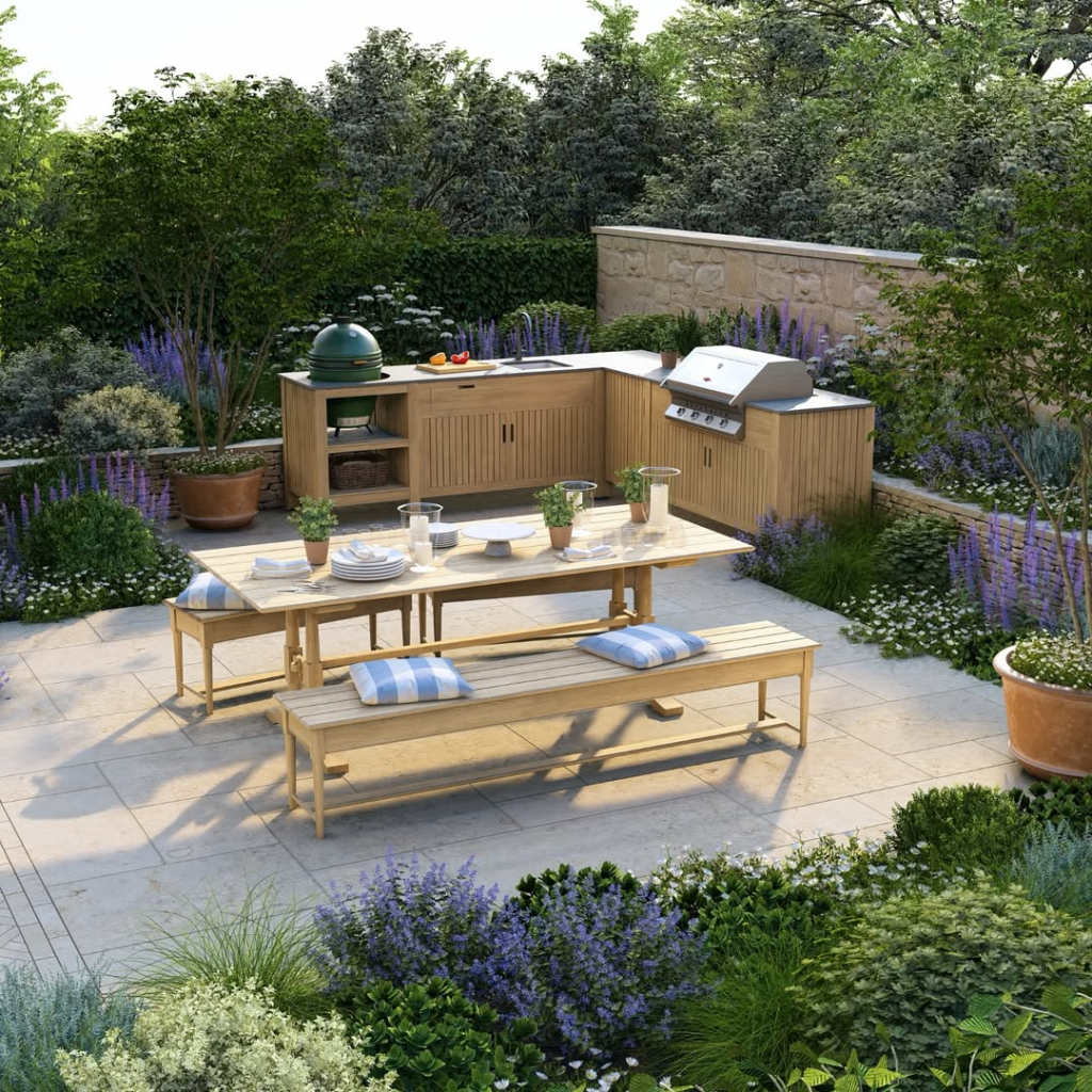 Function and beauty merge in this backyard dining area. A built-in kitchen, long wooden table, and lush surrounding greenery create an extension of the natural landscape. The space encourages real, unhurried meals and extended conversation, making dining feel effortless and inviting. Every design choice prioritizes comfort and usability while maintaining elegance. It’s a practical yet warm setting, perfect for gatherings with family and friends, where the beauty of nature complements the culinary experience.
