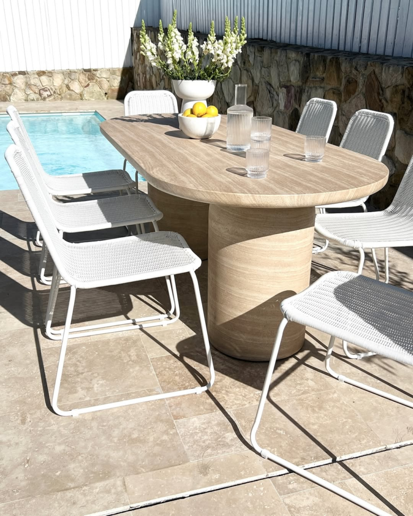 Clean lines, pale stone, and warm wood tones define this serene courtyard dining area. Minimalist in form yet softened by natural light and organic textures, it balances structure with calm. The space encourages intentional meals, transforming weekday lunches into moments of quiet luxury. Open and breathable, it feels effortlessly composed, with a subtle elegance that doesn’t need to assert itself. Every material and proportion has been thoughtfully considered, resulting in a backyard dining setting that’s modern, peaceful, and inherently welcoming.