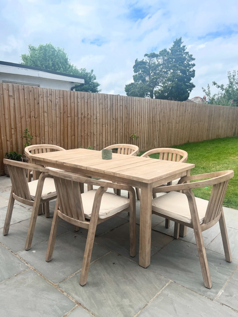 This outdoor dining setup prioritizes timeless comfort. Warm wood furniture, neutral cushions, and simple layouts create a welcoming, familiar environment. The space is approachable, effortless, and designed for everyday enjoyment. Each element contributes to a balanced aesthetic that feels naturally inviting. The area encourages casual meals, social interaction, and relaxation, providing a classic setting where simplicity and practicality enhance the overall outdoor dining experience without sacrificing style.