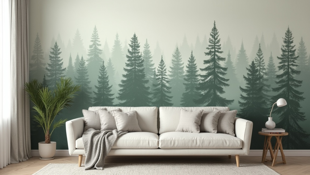 Misty pine forest peel-and-stick wallpaper evokes a serene woodland environment indoors. Soft greens and muted grays blend harmoniously with pale furniture and light wooden floors, creating a calming, cozy atmosphere.