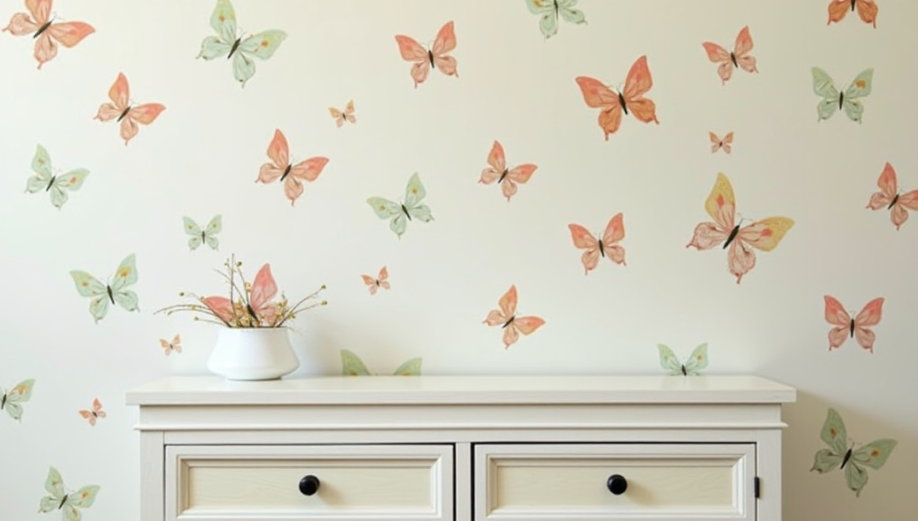 Applying soft pastel butterfly-patterned peel-and-stick wallpaper to furniture instantly transforms ordinary pieces into statement items. Muted pinks and greens create a whimsical yet understated charm.