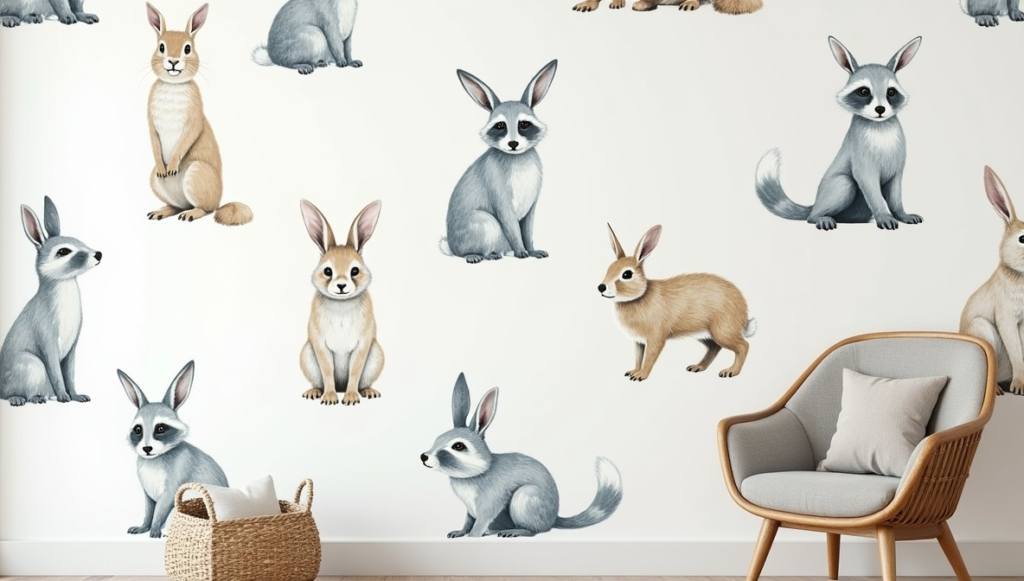Blue-toned woodland animal peel-and-stick wallpaper brings a soft, playful charm to nurseries or reading nooks. Gentle sketches of creatures like rabbits and raccoons add warmth without overwhelming the space.
