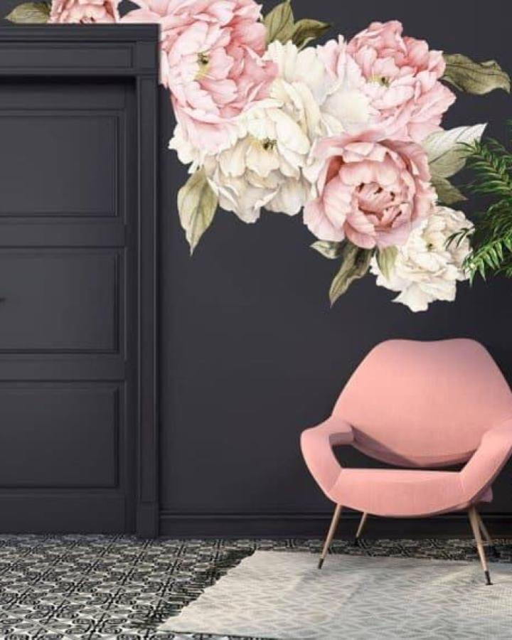 Peel-and-stick wallpaper with large pink and white flowers on dark backgrounds makes a dramatic impact. Soft peonies pop against deep charcoal walls, balancing boldness with sophistication.