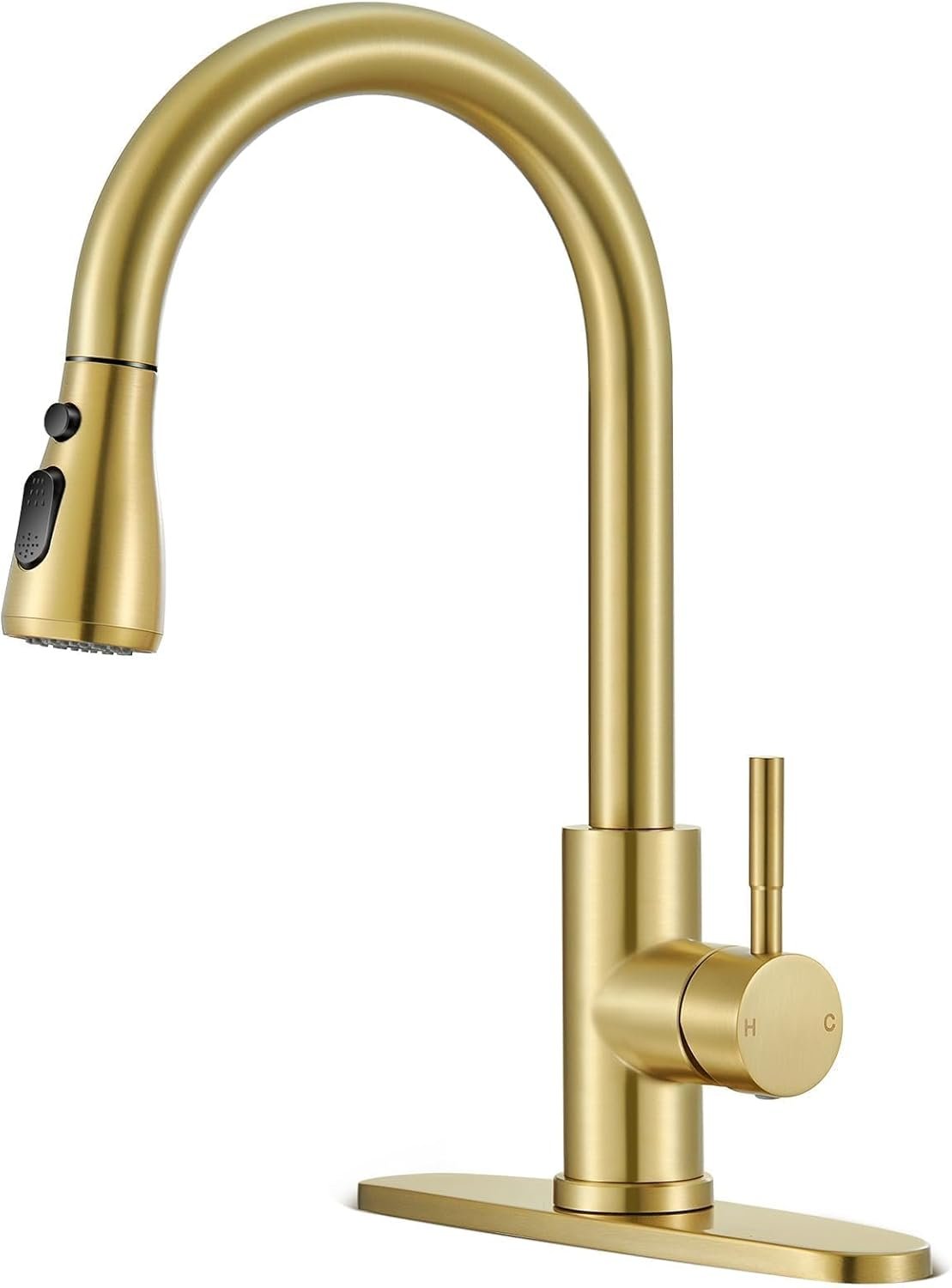 SUS 304 stainless steel gold kitchen faucet with high-arc pull-down sprayer, three spray modes, 360° rotation, lead-free, easy DIY installation, durable PEX hoses, and fingerprint-resistant finish for modern kitchens.