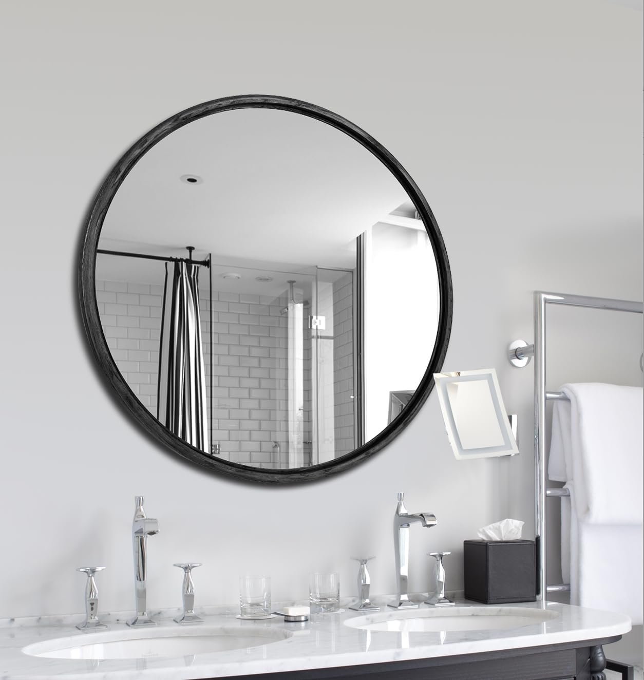 24-inch round white oak mirror with modern design, durable construction, and easy wall-mounting; ideal for bathrooms, bedrooms, or living rooms, reflecting light and complementing various décor styles.