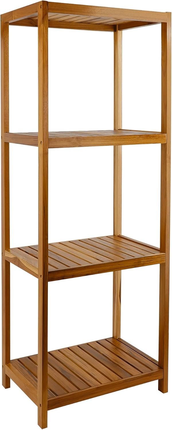 4-layer teak wooden bathroom stand shelf, 12×17.3×47.2 inches, smooth surface, sturdy and space-saving, versatile for toiletries, towels, books, or kitchen items, elegant design, easy assembly with included tools and instructions.