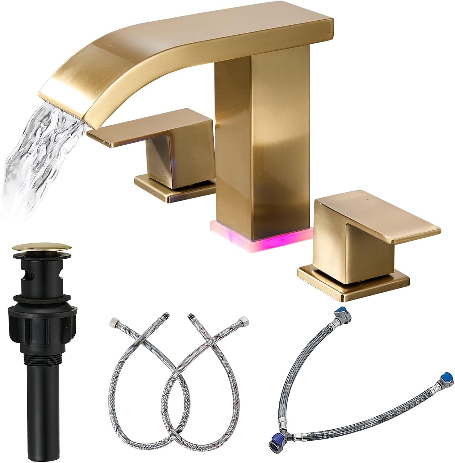 Brushed gold waterfall bathroom faucet with LED temperature lights, dual handles for precise control, 3-hole widespread design, high-arc spout, flow filter, and easy 30-minute installation for a stylish, spa-like vanity upgrade.
