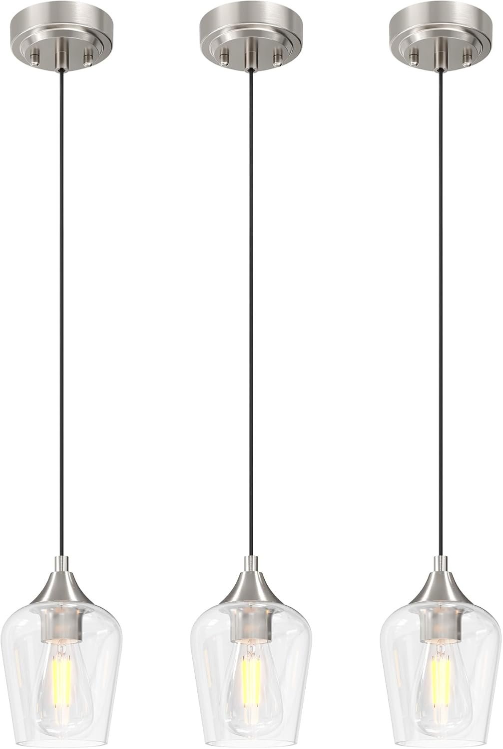Vonluce adjustable pendant lights with clear glass shades and nickel accents, height 9–66″, E26 bulb compatible, modern farmhouse style, perfect for bathroom, kitchen islands, dining, and living spaces.