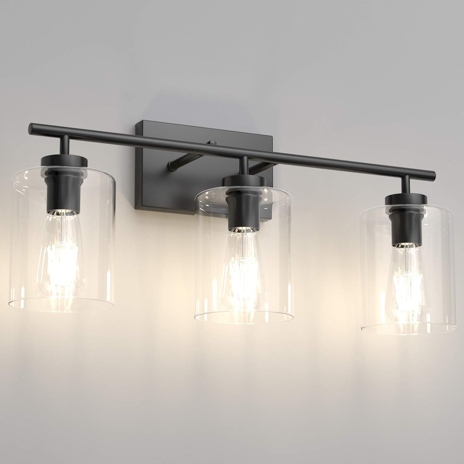 Vintage-style vanity light with clear glass shade, matte black frame, dimmable E26 socket, 24.4″ x 10.8″ x 7.5″, easy installation, compatible with LED, incandescent, and energy-saving bulbs.