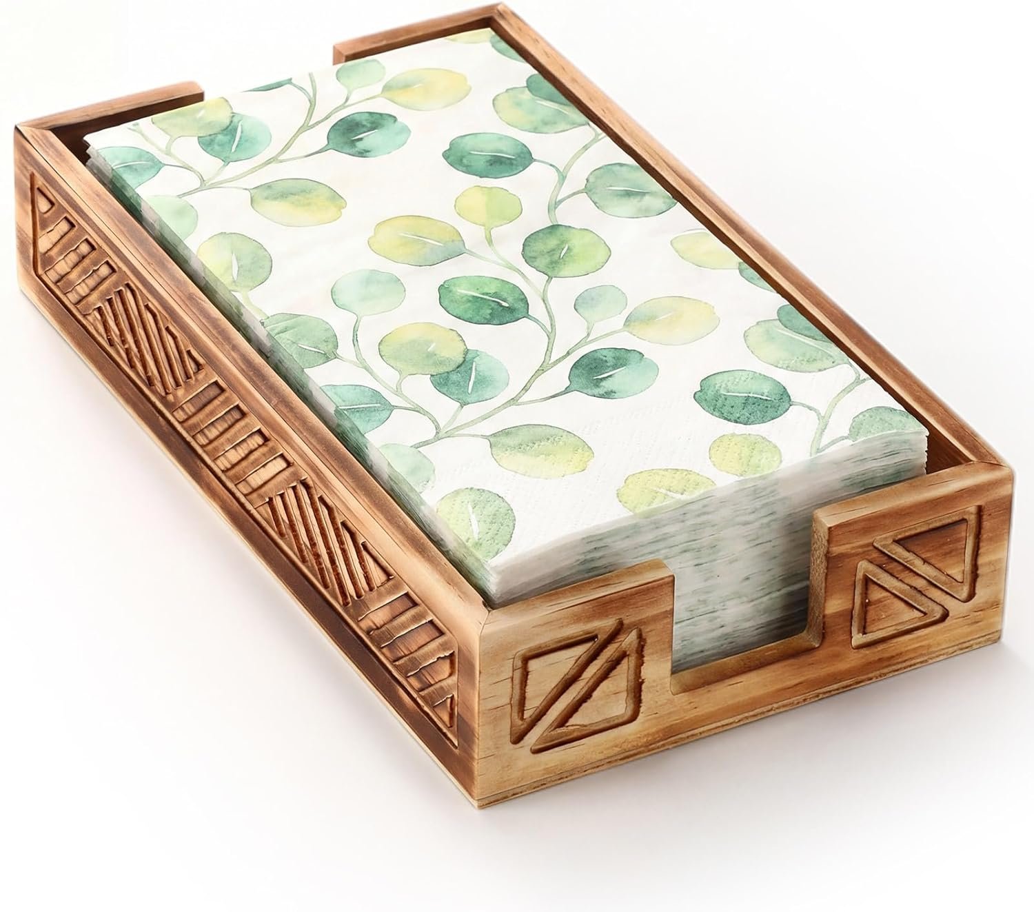 Solid pine wood guest paper towel holder tray with carved geometric design, open sides for easy dispensing, fits standard towels, durable smooth finish, versatile for countertop organization, jewelry, or small essentials, modern minimalist style suitable for bathroom, kitchen, or entryway décor.