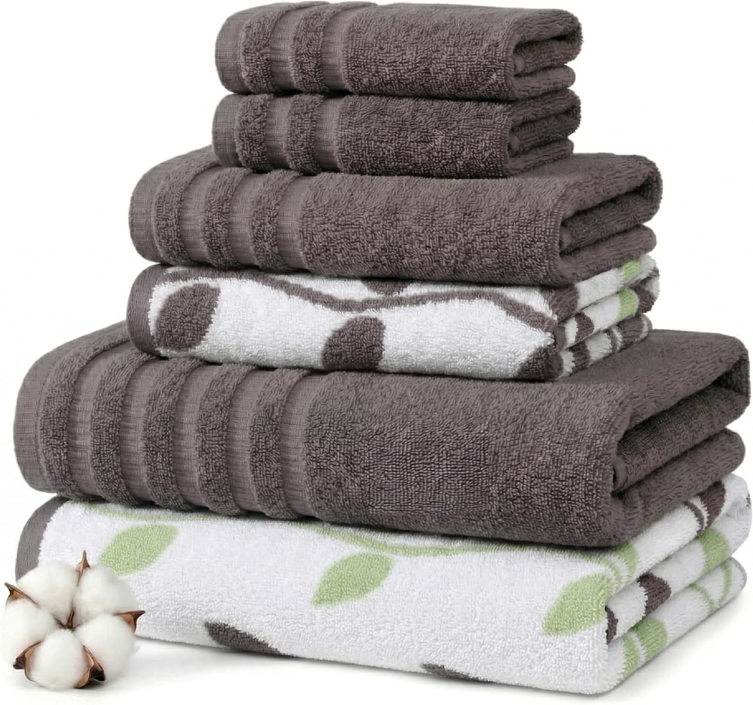 6-piece 100% cotton bathroom towel set with 2 bath towels, 2 hand towels, and 2 washcloths, 550 GSM plush absorbent fabric, organic vines design in gray, green & white, OEKO-TEX certified, soft, spa-quality, and gentle on skin.