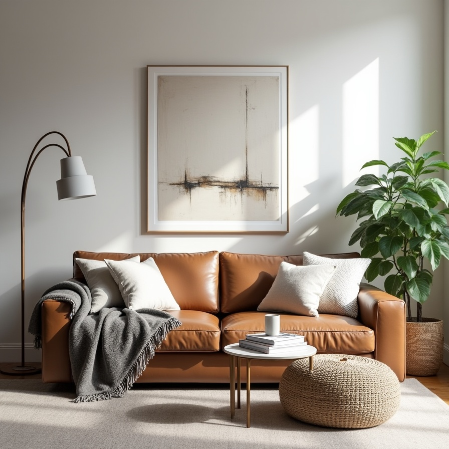 Scandinavian design is all about combining simplicity with comfort, and this living room exemplifies that beautifully. Neutral hues create a soothing backdrop, while a luxurious leather sofa draped with textured throws invites relaxation and warmth.