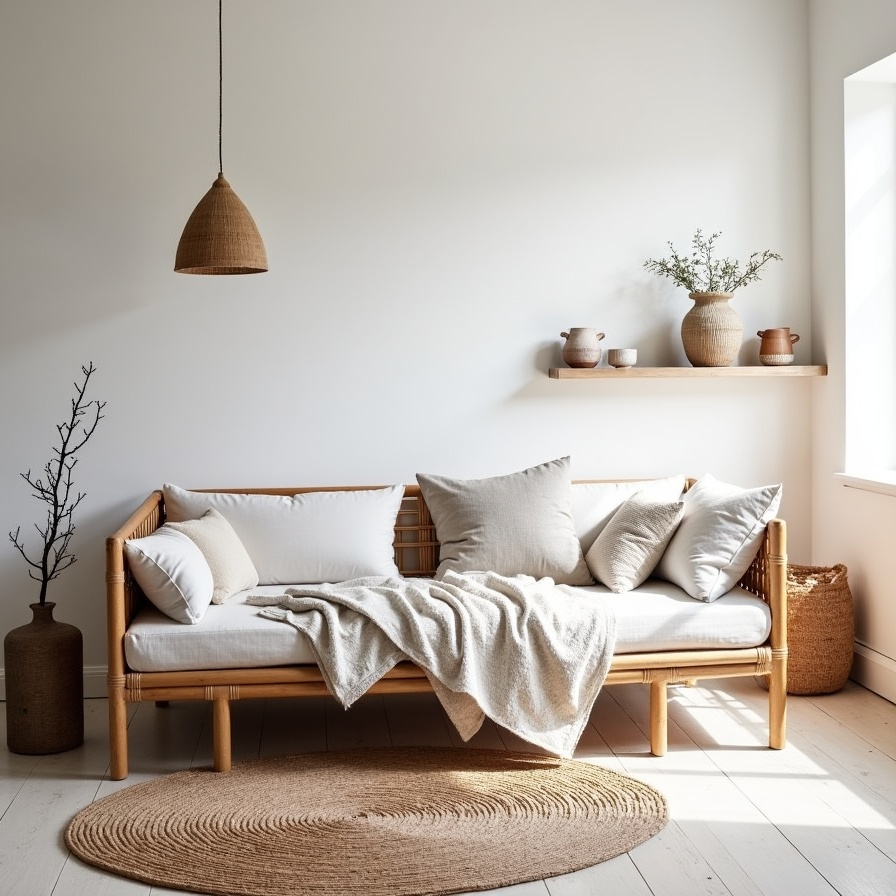 This Scandi living room is defined by warmth and simplicity. Neutral tones dominate, with a bamboo daybed inviting leisurely afternoons. Cushions and throws layer softness, creating a sense of comfort that aligns with the concept of hygge.