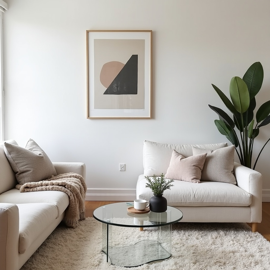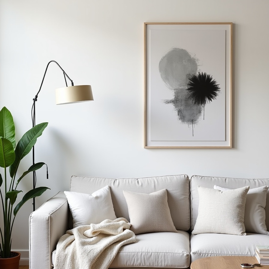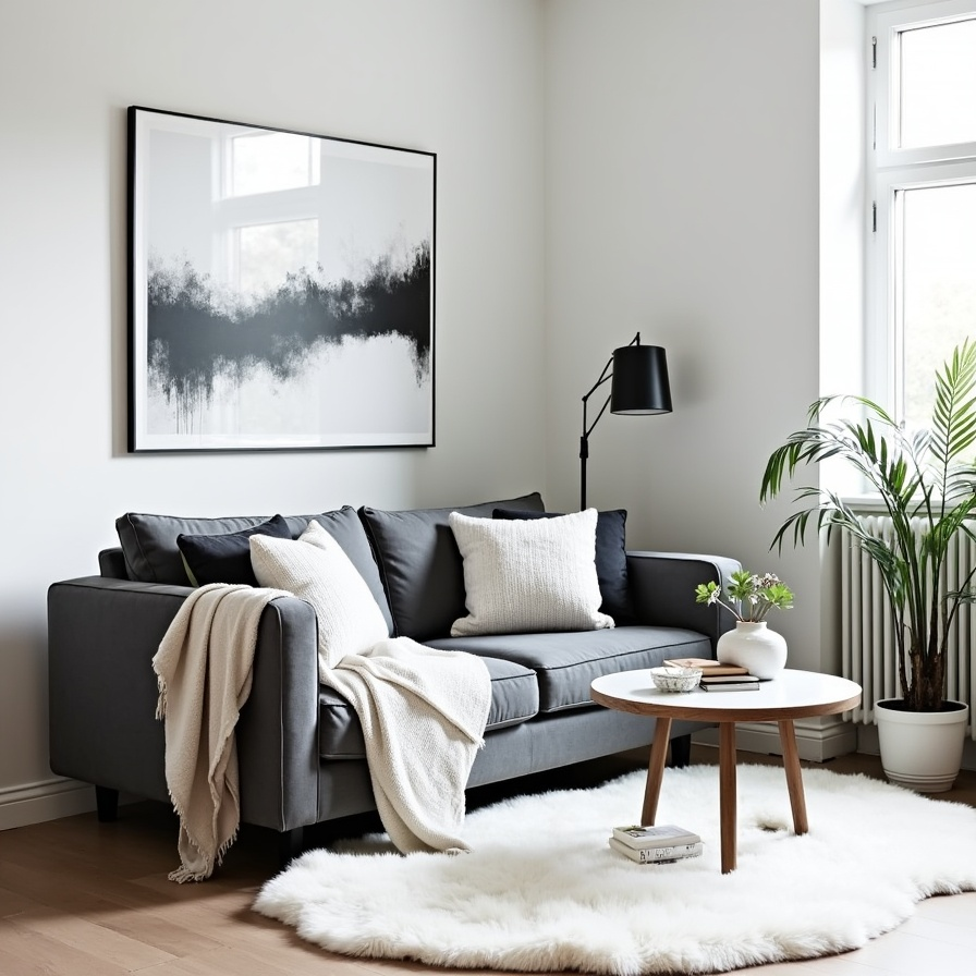 Clean lines define this Scandinavian living room, softened by plush cushions and a fur throw that invite relaxation. Muted abstract artwork serves as a modern focal point without disrupting the neutral harmony.