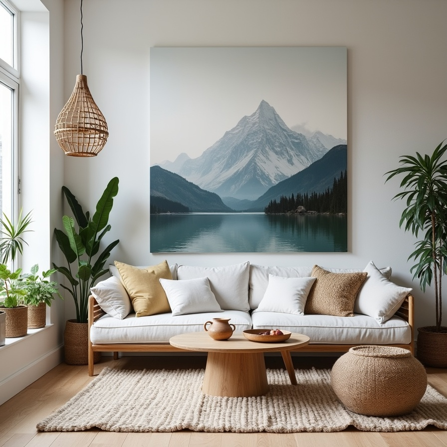 A large mountain landscape dominates the wall, infusing this living room with a sense of grandeur and calm. Cushioned seating offers a cozy spot for relaxation, reflecting the Scandinavian principle of comfort within minimalism.