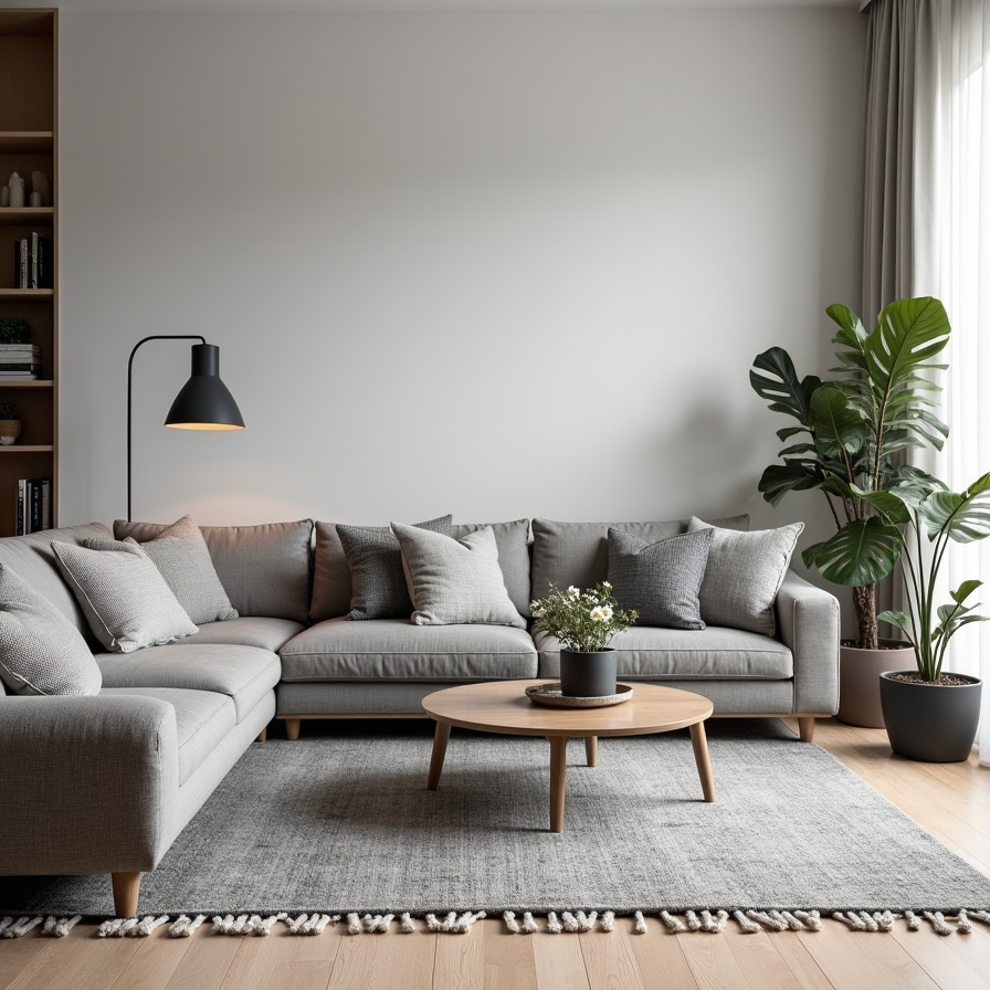 Layered shades of grey create a sophisticated yet cozy atmosphere in this Scandinavian living room. Clean-lined furniture is softened by plush cushions, and wood accents add warmth to the cooler palette.