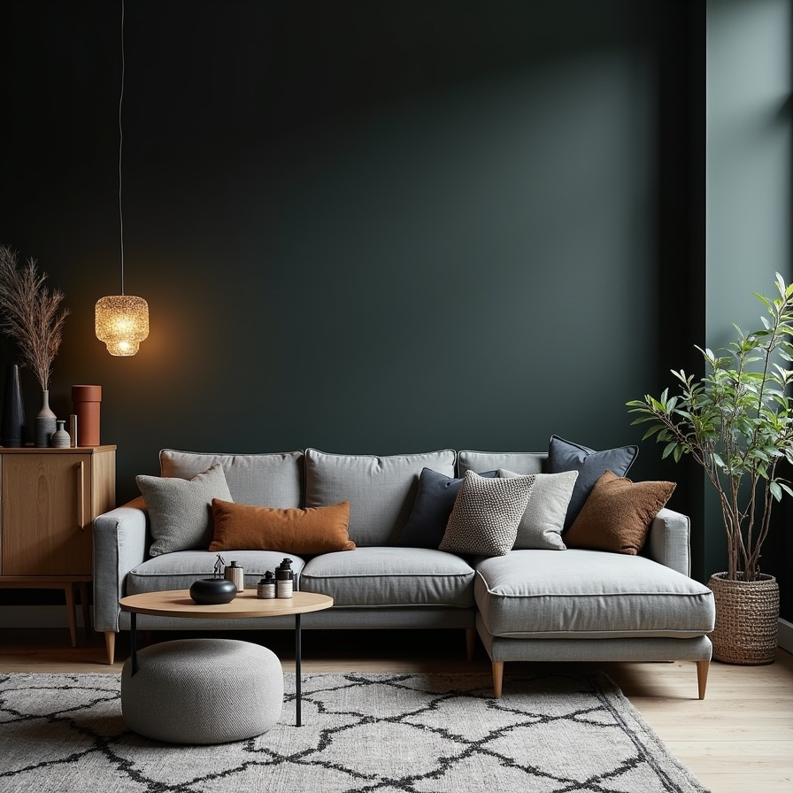 This living room leans into darker, more dramatic tones while maintaining Scandinavian minimalism. A comfortable grey sofa with textured cushions provides a cozy counterpoint to the bolder palette.