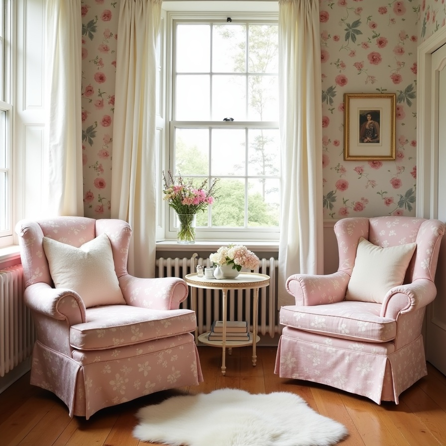 Step into a room that feels like a vintage postcard come to life. Soft pink floral patterns, slipcovered chairs with gentle ruffles, and sunlight spilling in from every corner create an airy, romantic atmosphere. This space doesn’t try too hard—it simply invites you in.