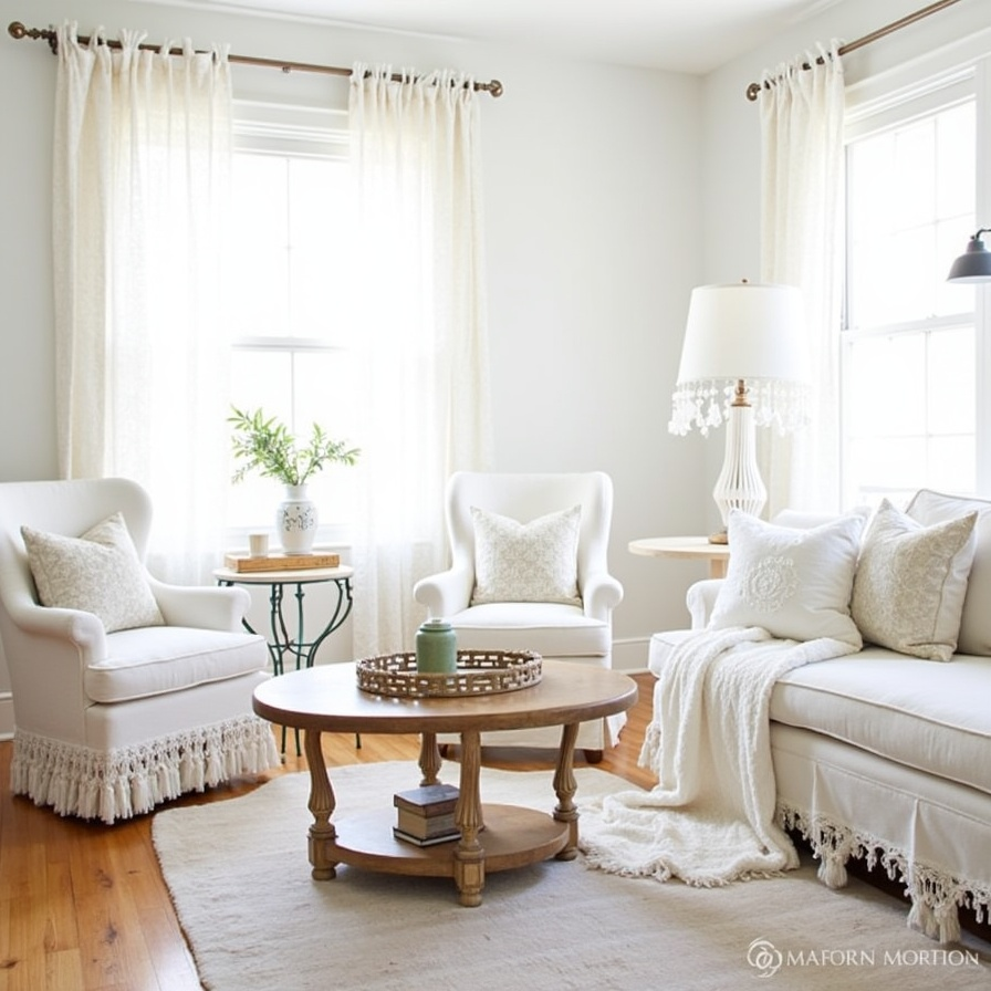 Texture takes center stage in this all-white haven. Lace curtains, embroidered pillows, and distressed wood floors make every corner feel curated yet lived-in. The space feels collected rather than staged, giving it a cozy, authentic charm.