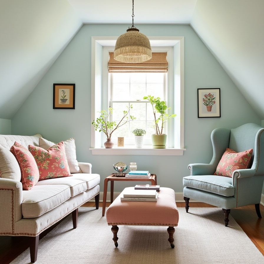 Step into a storybook attic transformed into a pastel sanctuary. Floral fabrics, fringed lampshades, and a soft palette of blues, blushes, and sage tones create a layered, playful atmosphere.