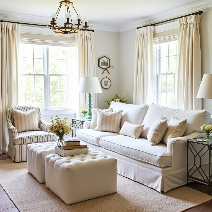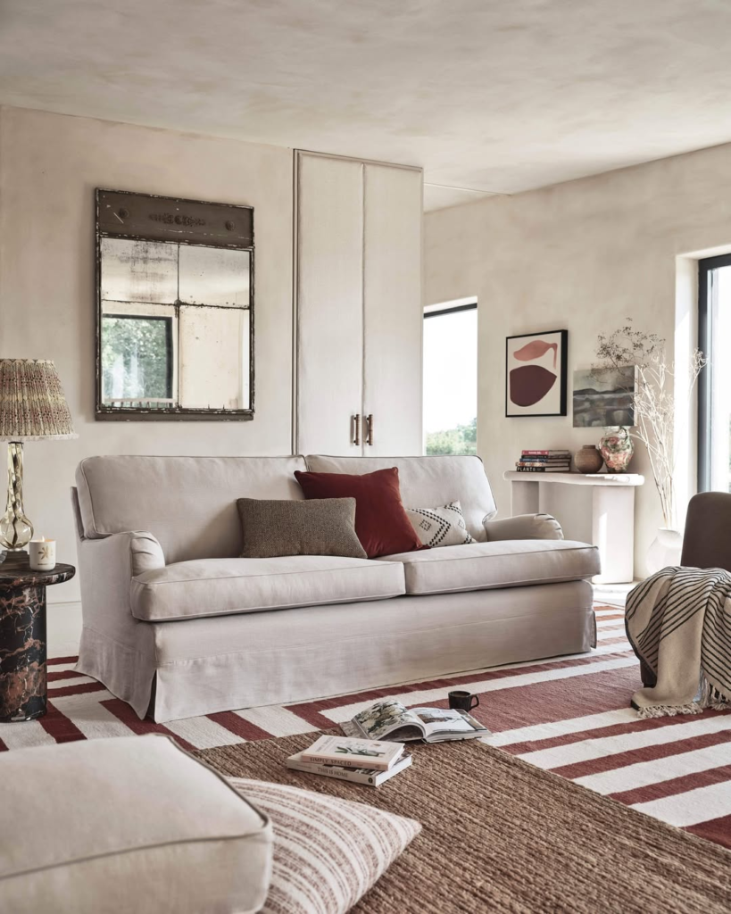 Blending contemporary structure with vintage warmth, this room is the more refined cousin of shabby chic. Clean lines, neutral slipcovers, and a striped rug create order, while warm-toned wooden accents and a vintage mirror nod to the past.