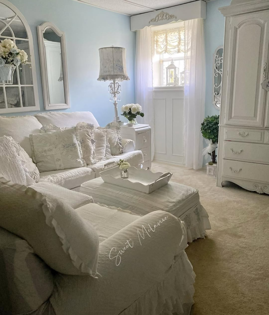 Pale blue walls provide a serene backdrop, while layers of white linens and soft furnishings add depth. Every item—from ruffled slipcovers to delicate lamps—feels thoughtfully chosen.