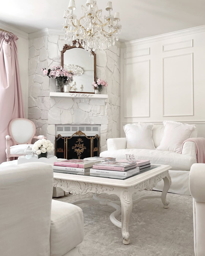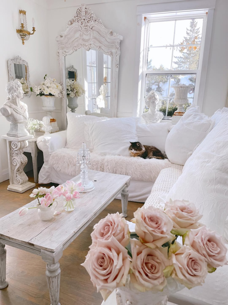 An all-white room can be far from boring. Carved mirrors, sculptural accents, and plush textures create visual interest, while soft pink roses introduce just enough color to keep the palette fresh.