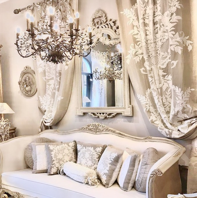 Elegance and drama meet in this room’s design. Ornate mirrors, cascading lace curtains, and a chandelier reminiscent of a French manor give it an almost cinematic quality.
