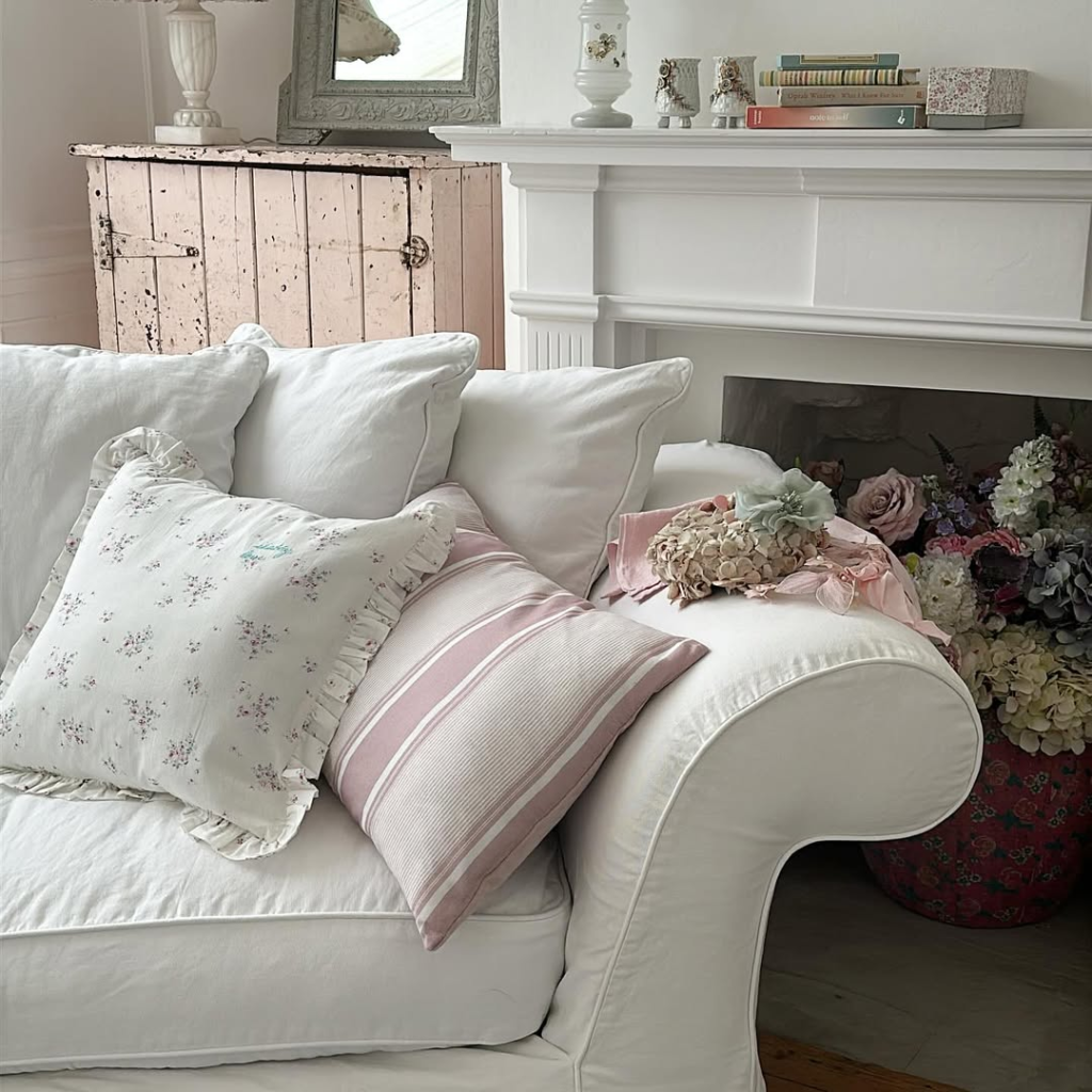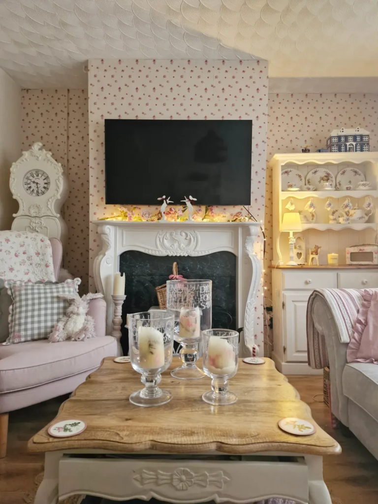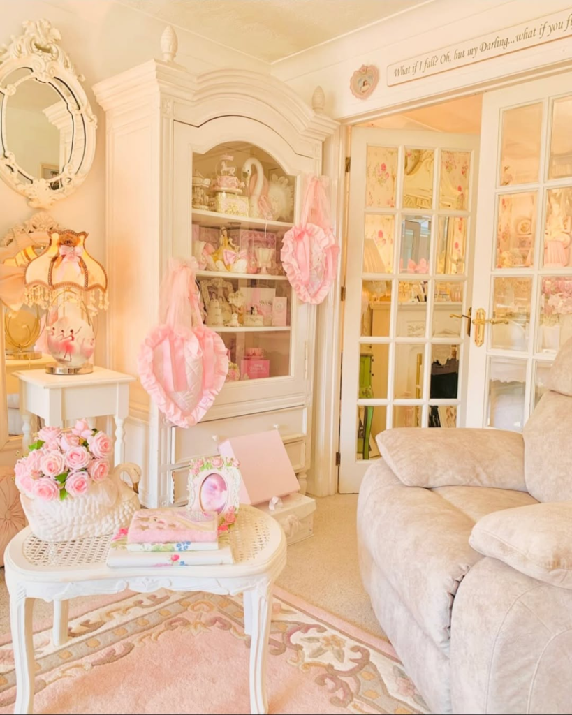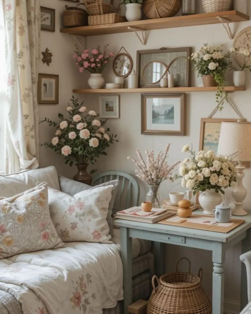 Here, shabby chic meets a hint of French boudoir. A gilded cabinet, pastel florals, and soft pink accents lend subtle glamour without tipping into excess.