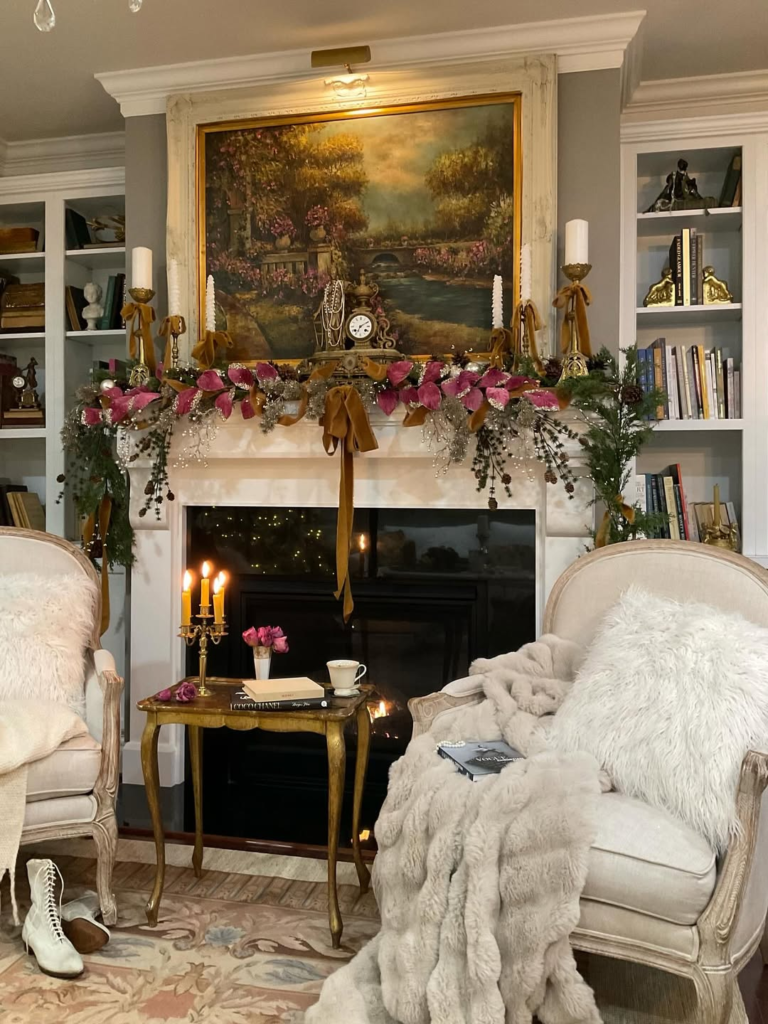 A fireplace becomes a stage for creativity here. Cascading garlands, gold bows, and a statement painting above the mantel bring drama without harshness.