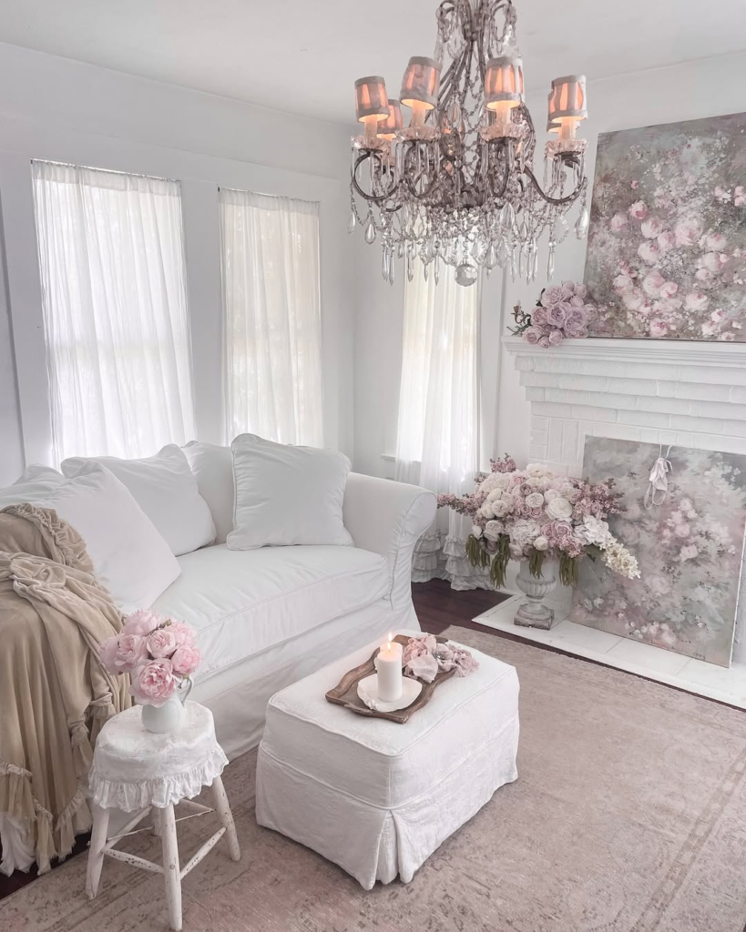 Soft whites and pale pink florals meet a sparkling crystal chandelier, creating a space that feels airy yet luxurious. Layers of linen, floral textures, and soft throws add depth and romance.