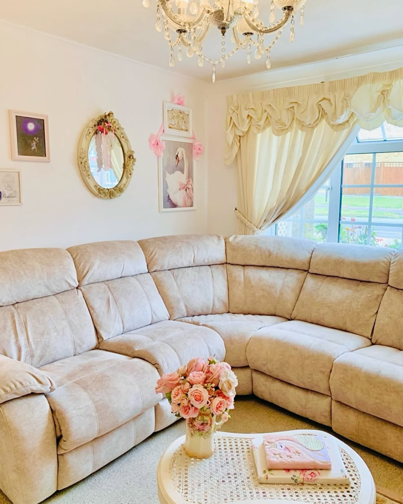 A plush sectional embraces the room, paired with swan-themed art, blush roses, and a crystal chandelier. Creamy drapes and delicate frames complete the dreamlike aesthetic.