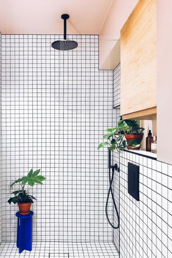 Minimalist grid tiles prove that simplicity can be striking. Crisp white squares outlined in black grout create graphic precision, especially when paired with matte black fixtures for contrast.