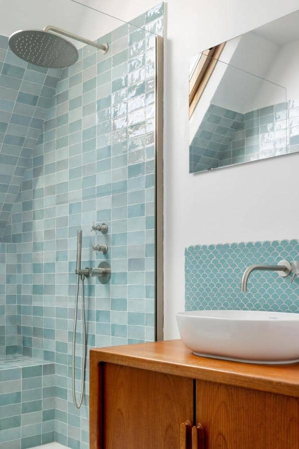 Icy aqua tiles instantly create a spa-like escape. Their reflective surface captures natural and artificial light, amplifying brightness in compact bathrooms.