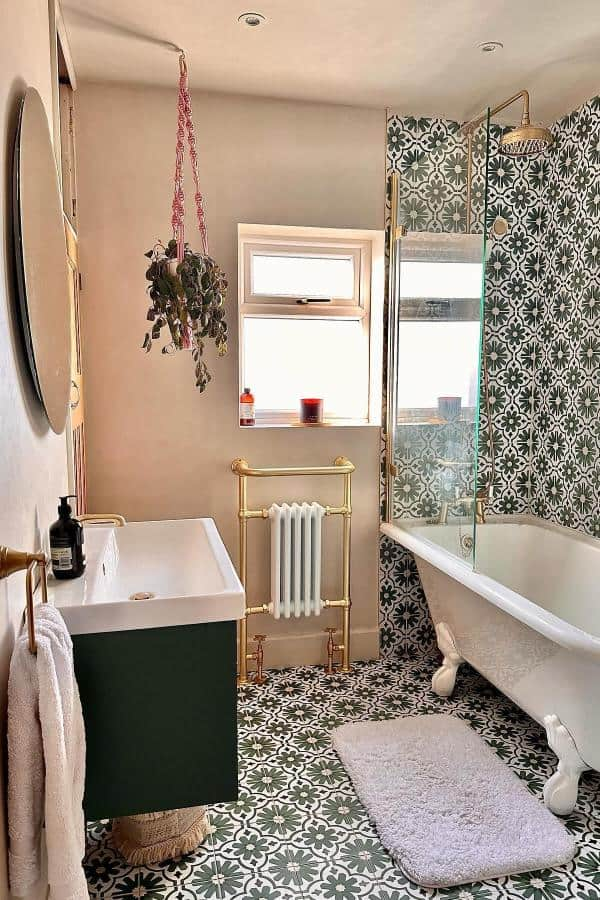 Bold emerald or hunter green tiles bring personality and depth to small bathrooms. Patterned tile floors layered with floral or geometric motifs add a sense of playful luxury.
