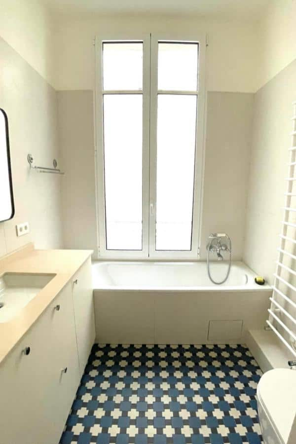 Geometric patterned floor tiles tie the design together, adding depth and dimension. A narrow window or clever lighting placement ensures the room remains bright.