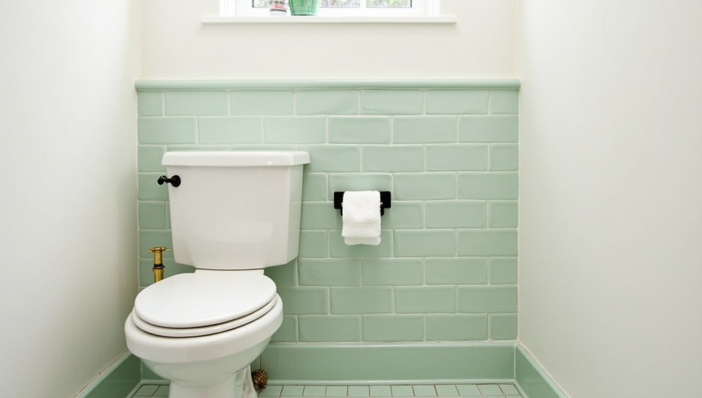 What a gem of a bathroom! Soft celadon mint tiles wrap the shower wall like a serene ocean wave, instantly making the space feel airy and expansive. The glossy finish reflects light beautifully, which is key in compact layouts.