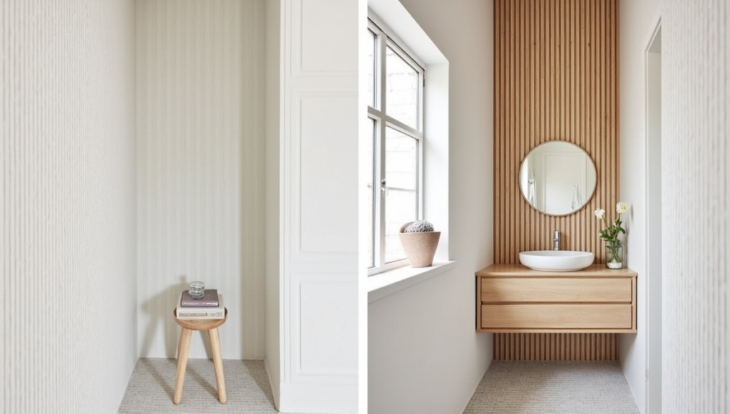 Vertical wood slats add depth and architectural interest. They create a Scandinavian-inspired warmth when paired with crisp white walls.