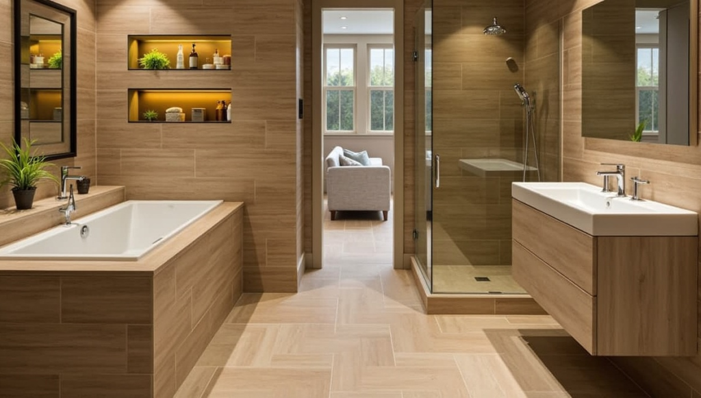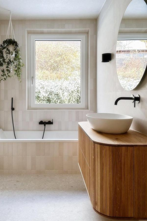 Creamy beige tiles create a calming foundation. A curved wooden vanity adds warmth and softness, especially when paired with a vessel sink.