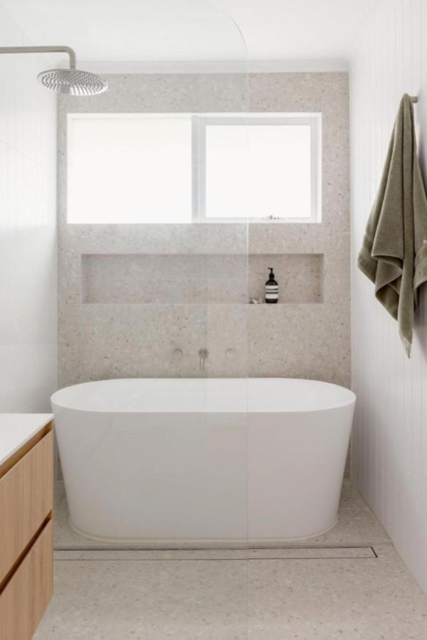 Terrazzo brings texture and subtle pattern without overwhelming a small layout. Soft beige or neutral terrazzo surrounding a freestanding tub creates a spa-inspired escape.