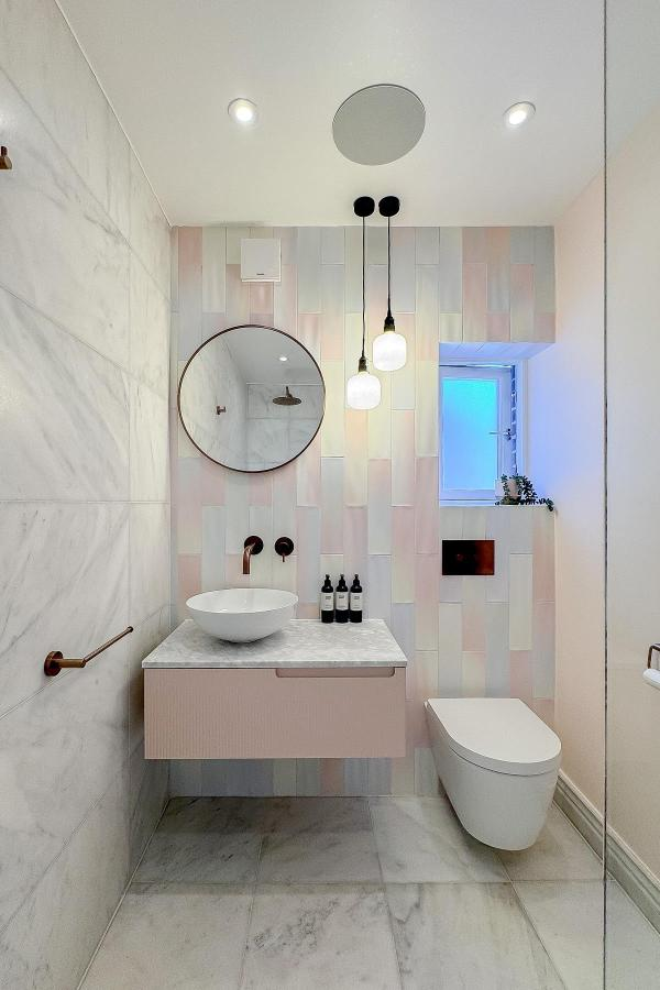 Soft pinks and pastel textures create a dreamy, uplifting atmosphere. Vertical tiles elongate the walls visually, making ceilings feel taller.