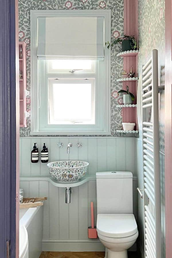 An artisanal sink or decorative basin adds personality, while slim shelving in coordinating tones keeps storage practical and stylish.